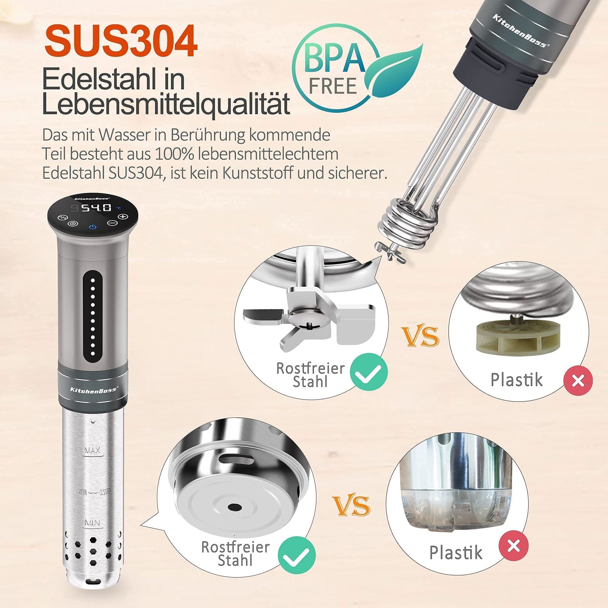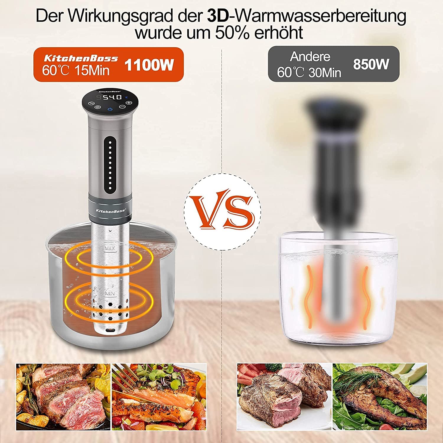 KitchenBoss Sous Vide Garer Stick Präzisionskocher•1100W •360° Zirkulation•40℃-90℃ Temperaturbereich • IPX7 Wasserdicht • LED Touch Display
