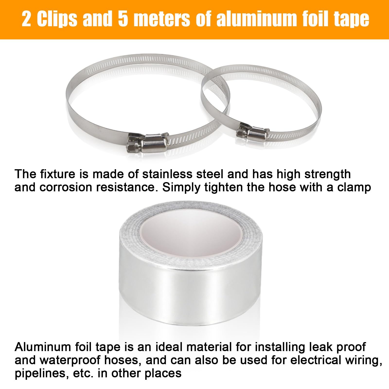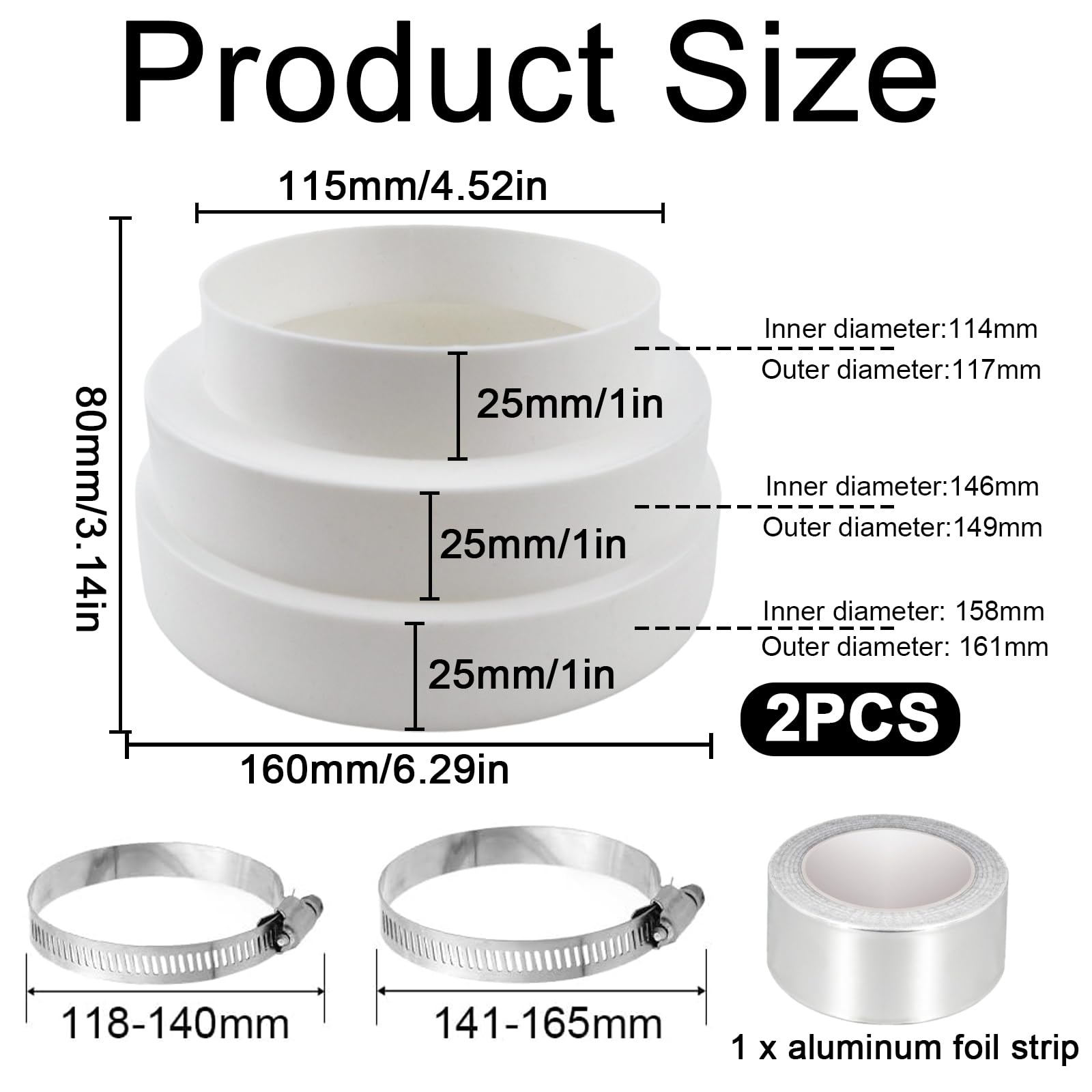 - Lieferumfang Enthalten: Sie erhalten 2 Reduzieradapter + 2 Edelstahlklemmen + Aluminiumfolienband. Der Innendurchmesser des Verbinders ist 3 mm kürzer als der Außendurchmesser. Die Klemmen haben zwei Größen, eine 118–140 mm und eine 140–165 mm.