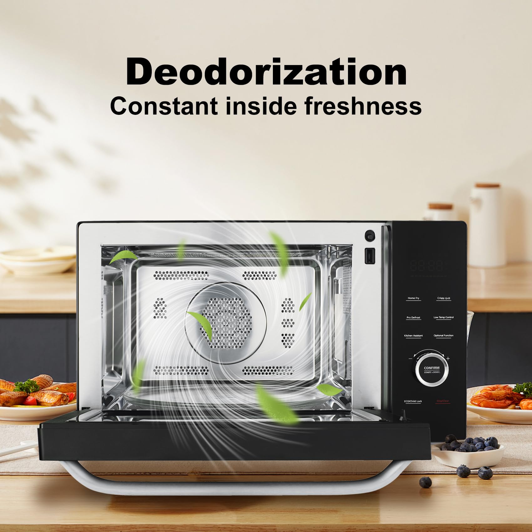 - 【Bequemlichkeit und Sicherheit】Microwellengerät mit Heißluft, ausgestattet mit Deodorierungs- und Dampfreinigungsfunktion für mühelose Sauberkeit. Die Drehteller-Reset-Funktion sorgt für zusätzlichen Komfort, während die Kindersicherung Ihre Kleinen vor Fehlbedienungen schützt, sodass Ihre Küche sicher und sorgenfrei bleibt.