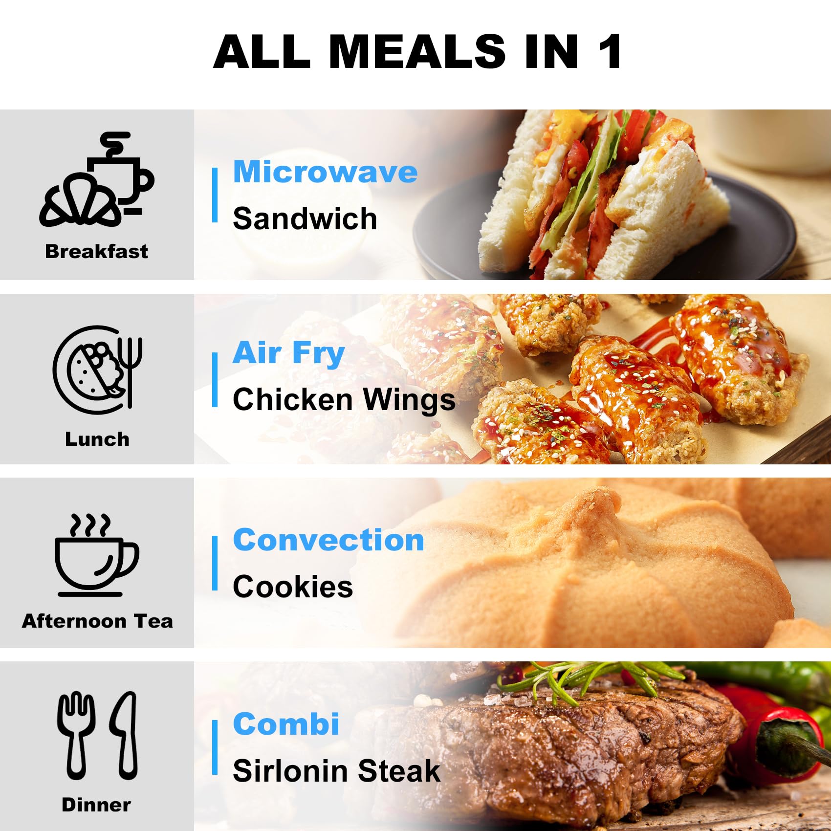 - 【Gesundes Kochen leicht gemacht】Genießen Sie mühelos eine große Auswahl an köstlichen Gerichten mit der Kombi-Mikrowelle, die über 10 automatische Menüs, 9 Heißluftfritteusen-Menüs und 4 knusprige Grillmenüs verfügt. Bereiten Sie einfach Kartoffelgerichte, Meeresfrüchte, Fleisch, Gemüse, Pasta, Pizza und Desserts in Ihrer Kombination Grill und Mikrowelle zu